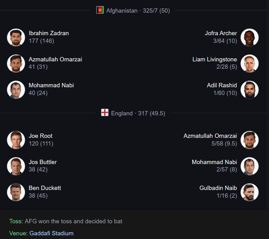 Afghanistan delivered a stunning upset against England, clinching an 8-run victory in their ICC Champions Trophy Group B clash in Lahore on Wednesday. Chasing a target of 326, England was bowled out for 317 in 49.5 overs, resulting in their elimination from the tournament.