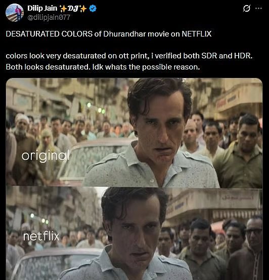 While Ranveer Singh’s spy-thriller Dhurandhar is dominating Netflix’s Top 10 list following its January 30, 2026 premiere, the digital release has sparked a fierce technical “war” on social media. After fans initially slammed the film for being “censored,” the outrage has shifted to the movie’s visual quality, with netizens claiming the OTT print is “flat and lifeless.”