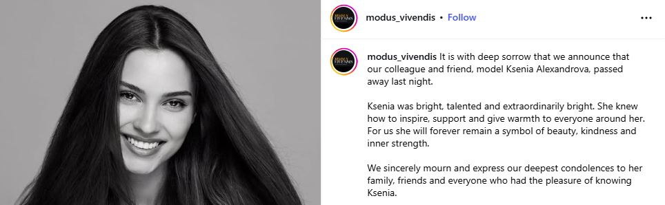 Modus Vivendis, her modeling agency, announced the sad news of her death in a statement posted on Instagram. The agency said, “It is with deep sorrow that we announce that our colleague and friend, model Ksenia Alexandrova, passed away last night.” “For us, she will always be a symbol of beauty, kindness, and strength.”