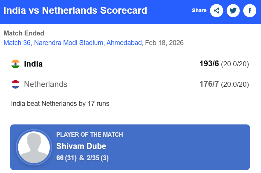 Varun Chakravarthy was the standout bowler for India, picking up three wickets, including two in two balls, to dent the Dutch chase. Shivam Dube also chipped in with two wickets, while Jasprit Bumrah delivered a disciplined spell to keep the pressure on the opposition.
