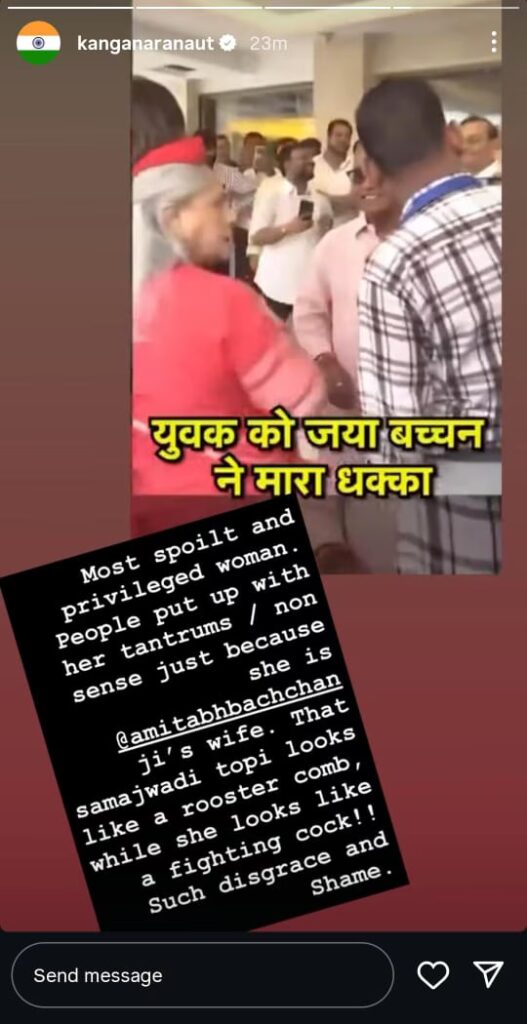 Kangana Ranaut shared the video on her Instagram Stories, accompanied by a scathing caption. She wrote, “Most spoilt and privileged woman. People put up with her tantrums/non sense just because she is @amitabhbachchan ji’s wife. That samajwadi topi looks like a rooster comb, while she looks like a rooster cock!! Such disgrace and shame.”