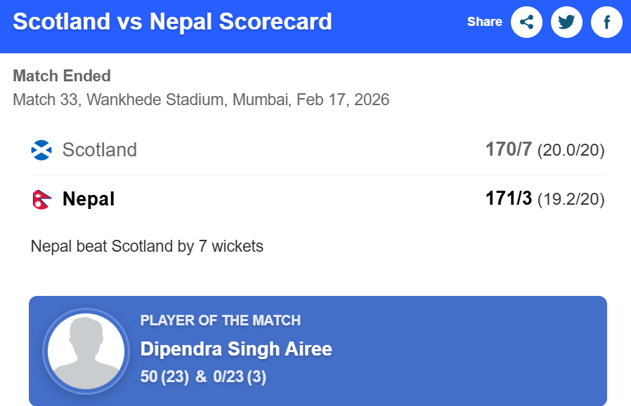 Nepal wrapped up their T20 World Cup 2026 Group C campaign on a high, defeating Scotland by seven wickets in an exciting chase, thanks to a blistering unbeaten half-century from Dipendra Singh Airee. Airee’s explosive knock of 50 off just 23 deliveries ensured Nepal chased down Scotland’s 171-run target with four balls remaining.