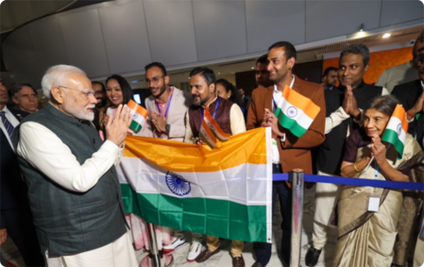 Waving Indian flags, members of the community gathered outside the hotel to warmly welcome the Prime Minister. PM Modi spent time interacting with them, particularly children who had come to greet him.