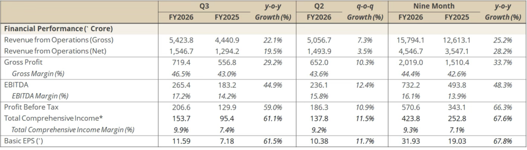 - EBITDA of Rs. 732.2 Cr (+48.3%) at 16.1% margin (compared to 13.9% in 9M FY25)
