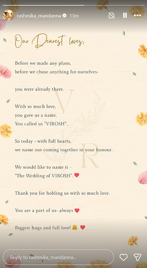 Actors Rashmika Mandanna and Vijay Deverakonda have officially revealed that their upcoming wedding will be called “The Wedding of VIROSH”, a name inspired by their fans. The moniker, a blend of their names, has long symbolised the affection and support of admirers and is now the official identity of the couple’s celebration.