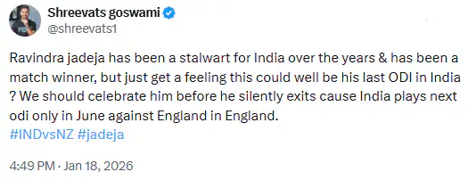 Speculation around Ravindra Jadeja’s future in ODIs has intensified after a tweet by his former India U19 teammate Shreevats Goswami went viral during the third ODI against New Zealand. The tweet suggested that the ongoing match at Holkar Stadium in Indore could potentially be Jadeja’s last 50-over appearance for India.