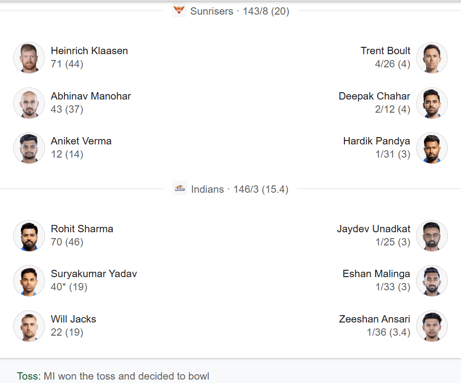 - Deepak Chahar (2/12) and Hardik Pandya (1) kept SRH under constant pressure.