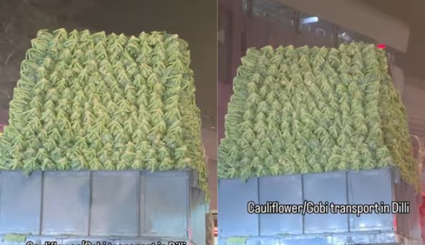 A truly strange sight on the congested roads of Delhi has recently captured the attention of social media, leaving many viewers both amused and concerned. A large quantity of cauliflowers was captured being transported, stacked high and apparently stuck tightly together, completely exposed to the elements and heavy traffic.