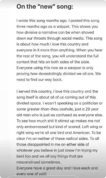Bryan, who served in the U.S. Navy for eight years before being honorably discharged in 2021, tried to put the song in context and respond to the flood of criticism in a series of posts on his Instagram Story.
